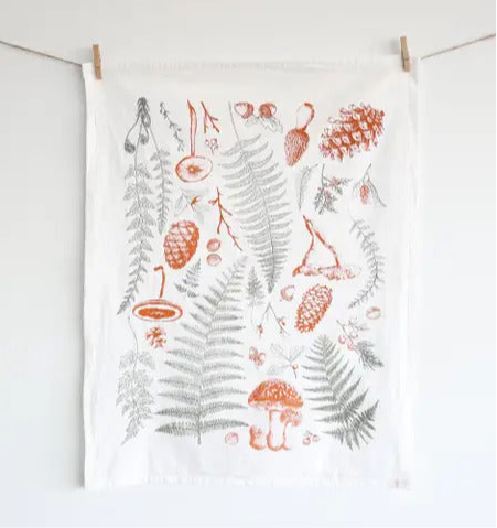 Bring the charm of the forest to your kitchen with our Forest Floor Tea Towel. Featuring a whimsical print of mushrooms and ferns in clay and green tones against a crisp white background. Crafted from recycled cotton yarn and proudly made in the US, it combines eco-friendly materials with artistic design for a beautiful and functional addition to your home.